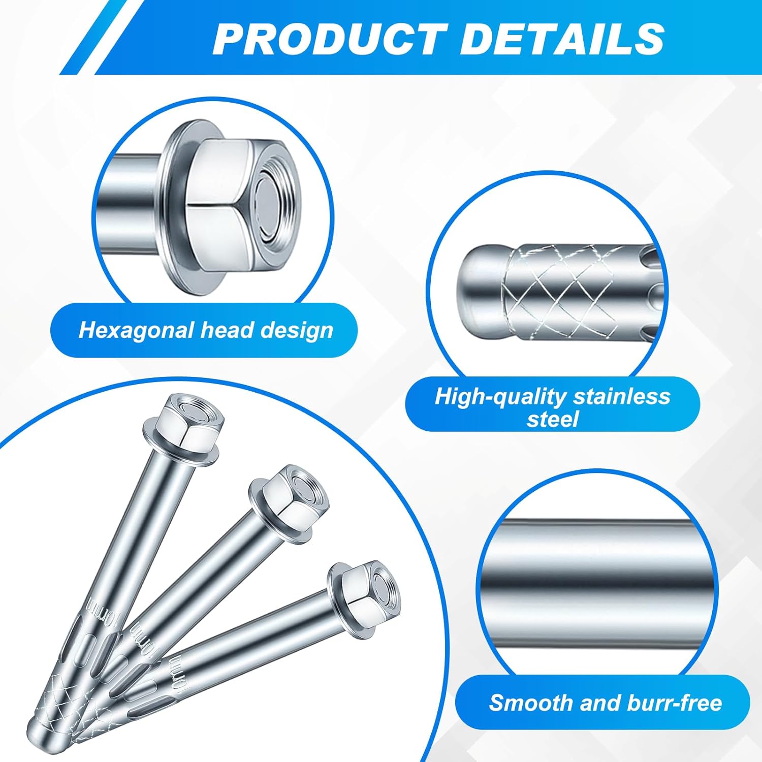 Features: The anchors are supplied in quantity within a single package. This packaging approach supports projects requiring multiple fasteners, helping maintain an organized workspace and reducing the frequency of reordering for ongoing tasks. The hexagonal head design accommodates standard wrench or socket tools. This allows for straightforward application of tightening torque during installation, facilitating correct setting of the anchor assembly. Specifications: Material: galvanizing Color: silver Size: 3/8" X 3" Package includes: 100 x Hex head sleeve anchors Notes: Manual measurement, please allow slight errors on size. The color may exist a slight difference due to different screen displays Note: pre-drilling is required before using this product Length Tolerance: ±2.5mm for the length. Outer Diameter Tolerance: ±0.25mm for the outer diameter