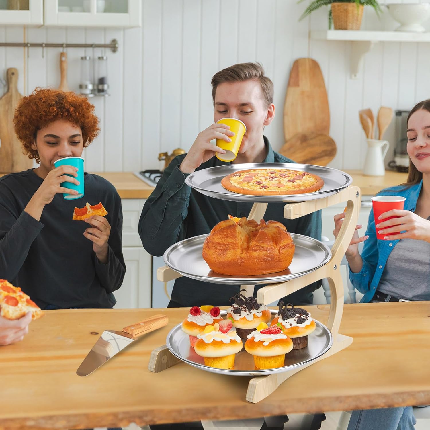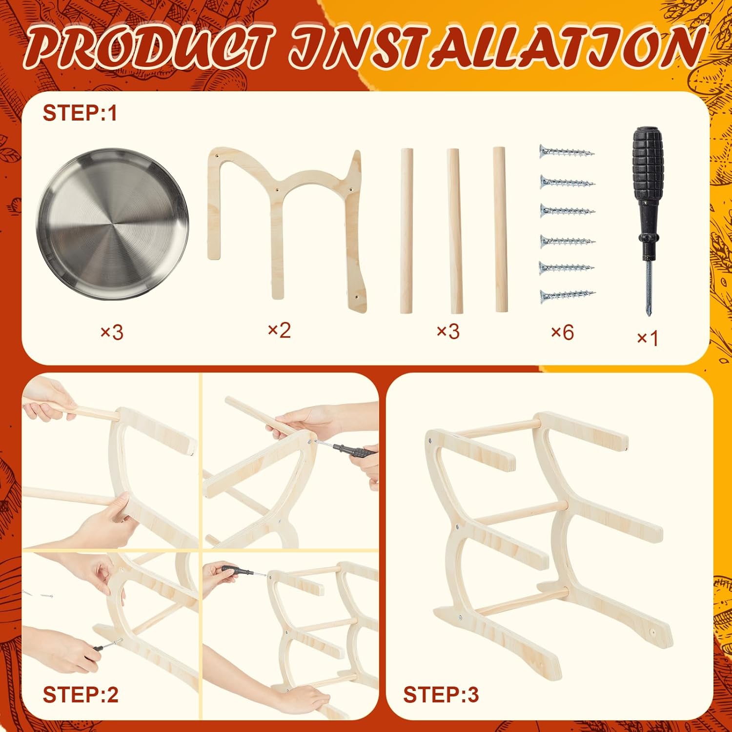 Features: The pizza tray is made of stainless steel, with a smooth surface that is easy to clean. It can be quickly cleaned with detergent after use. The pizza rack set can also be applied as a stand for drying small items, and more importantly, it can be applied in the kitchen to store spice bottles. Specifications: Material: Pizza pan: stainless steel Pizza stand: wood Color: mainly silver Size: Pizza pan: 12 inch Pizza stand: about 13.8 x 8.3 x 5.7 inches/ 35 x 21 x 14.5 cm Package includes: 6 x Pizza pan 6 x Pizza peel 2 x Pizza stand Notes: Manual measurement, please allow slight errors on size. The color may exist a slight difference due to different screen displays.