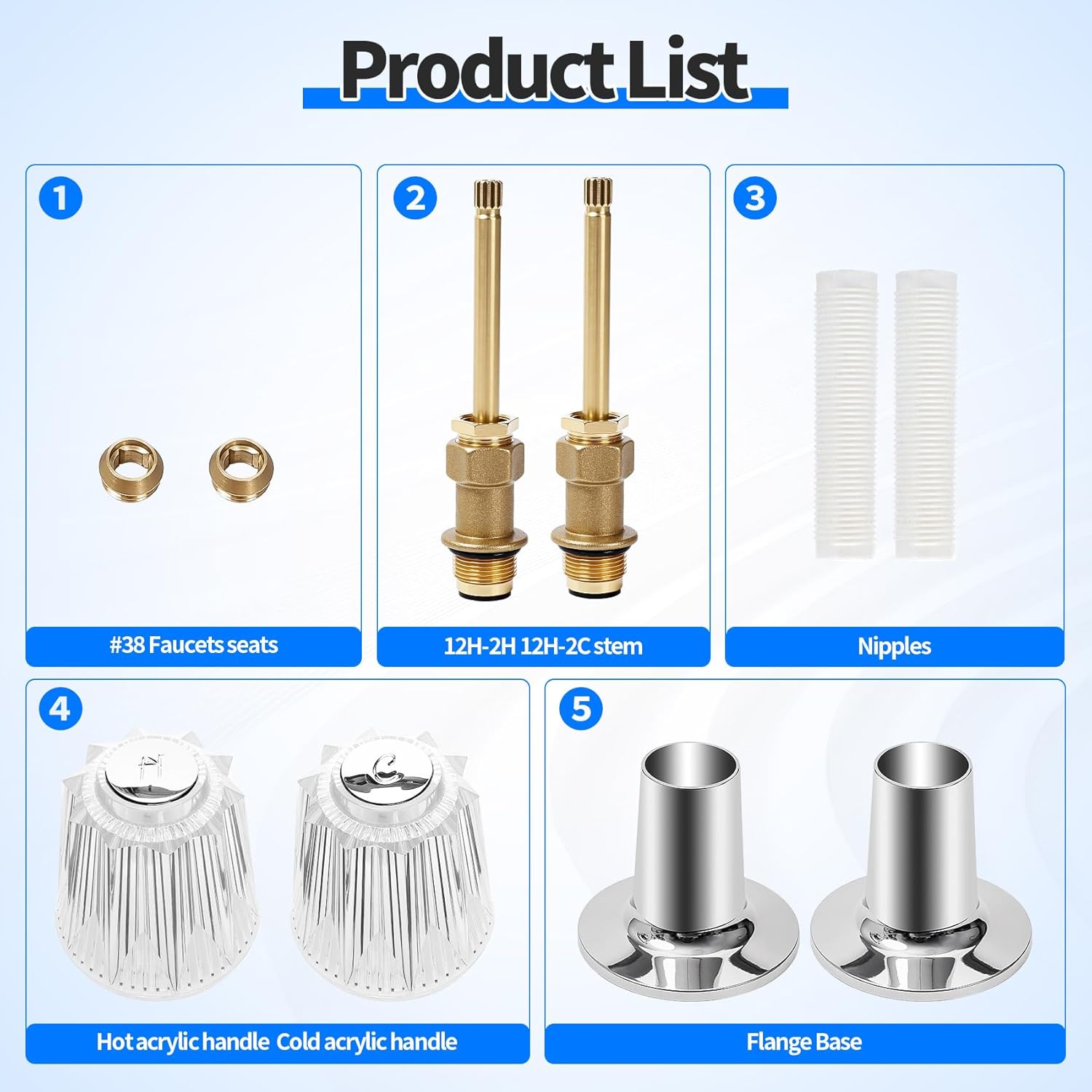 | Included Components | #38 seats, 12H-2H Stem, 12H-2C Stem, H/C acrylic handle – pair, chrome flange with nipples, socket wrench |