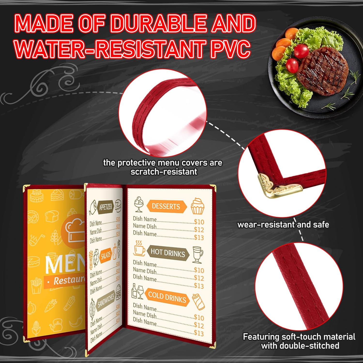 Features: The package includes bulk menu covers, making it a value for larger establishments. Whether you're running a cozy café or a bustling bar, this set ensures your menu is consistent and polished across all your tables, accommodating busy hours seamlessly. Crafted from transparent PVC, these menu covers are not only visually appealing but also easy to clean, ensuring hygiene standards are met with minimal effort. Specifications: Material: PVC, leather Color: mainly clear and wine red Size: about 8.5 x 11 inches/ 22 x 28 cm Package includes: 24 x Menu covers Notes: Manual measurement, please allow slight errors on size. The color may exist a slight difference due to different screen displays