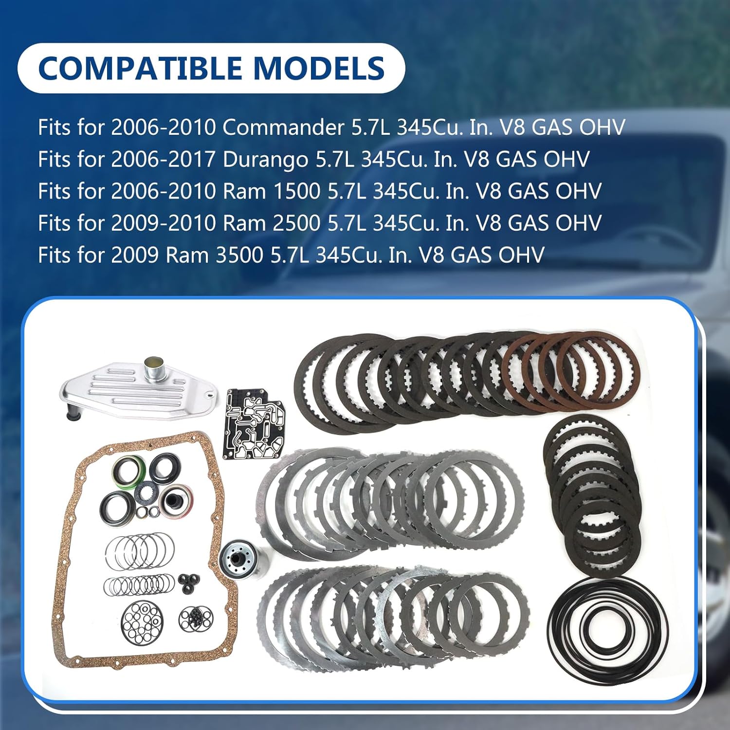 Transmissions Master Rebuild Kit with 4WD Filter Friction Steel: High quality and durability 📍Replace Part: 45RFE 545RFE 65RFE 🚩Compatible Models : Fits for 2006-2010 Commander 5.7L 345Cu. In. V8 GAS OHV Fits for 2006-2017 Durango 5.7L 345Cu. In. V8 GAS OHV Fits for 2006-2010 Ram 1500 5.7L 345Cu. In. V8 GAS OHV Fits for 2009-2010 Ram 2500 5.7L 345Cu. In. V8 GAS OHV Fits for 2009 Ram 3500 5.7L 345Cu. In. V8 GAS OHV Transmissions Master Rebuild Kit Features: Excellent workmanship, solid and durable material Pre-shipment quality control for guaranteed quality Stable performance, easy to install You Will Get: 1set Transmission Master Rebuild Kit, Includes:Overhaul Kit (Gaskets, Metal Clad Seals, O-rings, Seals)Friction Plate ModuleSteel Plate Module4WD / 4x4 Filter (Also fit for 2WD filter between 2010-UP)Spin Filter Warm Tips: 1. Please check the product model carefully before purchase, the number is the same as yours 2. Please standardize the installation to ensure that the product can be well adapted to your car 3. Buyers are responsible for paying any potential additional charges, such as customs duties and import taxes.Our Advantages: We have been committed to developing excellent auto parts products, providing customers with reliable high-quality products. And we have a professional customer service team to provide timely services to customers and enhance the shopping experience.