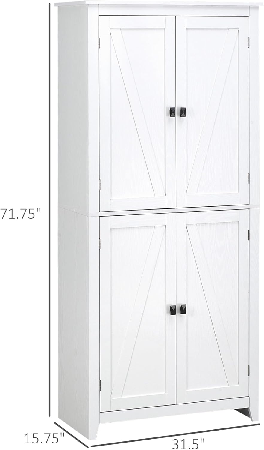 72" Freestanding 4-Door Kitchen Pantry, Storage Cabinet Organizer with 4-Tiers, and Adjustable Shelves, White
