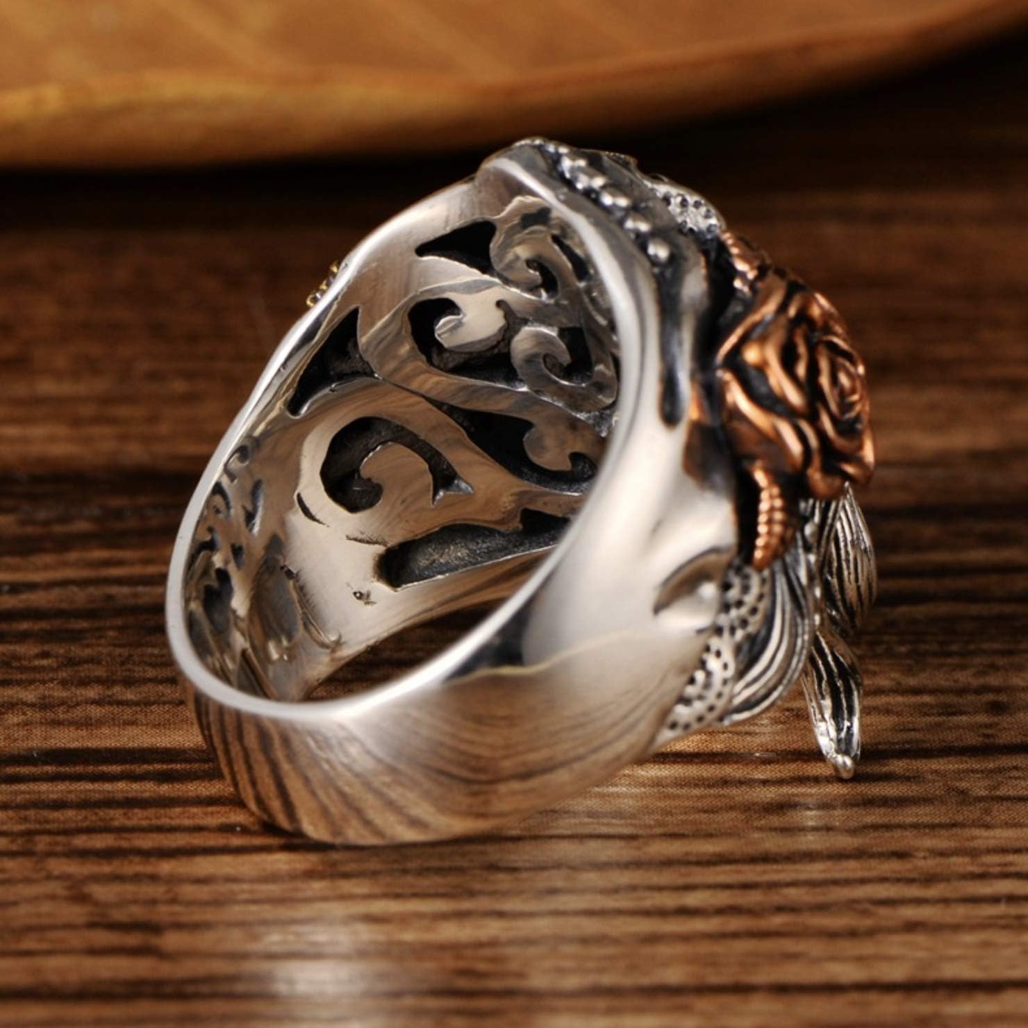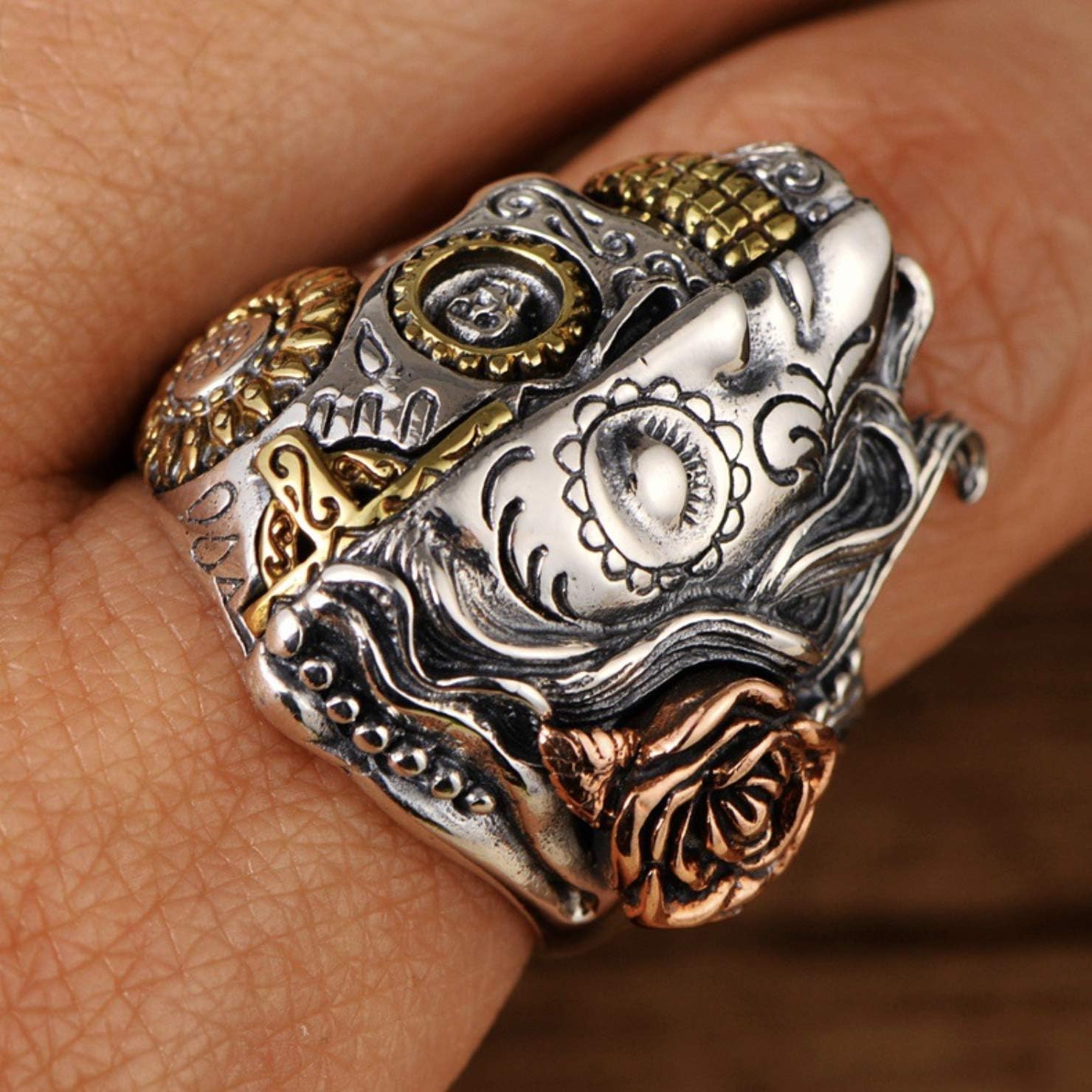 Skull series, this is a brand new design, half face sugar skull ring, it's made with 100% real 925 sterling silver, the gold part is brass plated. Dainty biker ring, punk style. Classic skull ring for both men and women, unisex skull ring. It's special, different with other kinds of skull rings, it gets two faces. Just like us, i believe that we all have two parts in the life. Sometimes stay as quiet, sometimes stay as mad. How about you?This could be a great gift for both men and women, we have free beautiful gift box, and free gift message. Gift it on a special day for the special one, birthday gift, valentine's day gift, anniversary gift, halloween gift, easter gift, father's day gift, mother's day gift, etc.Details❤️Metal: 925 Sterling Silver, Brass❤️Ring Size: 7.5 US - 12 US❤️Adjustable: No❤️Ring Width: 26mm, 6mm❤️Shape: Skull❤️Weight: 26.0g❤️Color: Silver and Gold❤️Packing: Beautiful Gift Box & Postcard & Silver Polishing ClothService100% satisfaction and money back guarantee. This exquisite jewelry gives you a totally fresh impression. Just be happy to add this beautiful ring to your jewelry collection. This is our mission: to make you happy with our products. And if you are not, don't be mad and don't be hesitate, contact us. We are committed to creating quality products and services for you