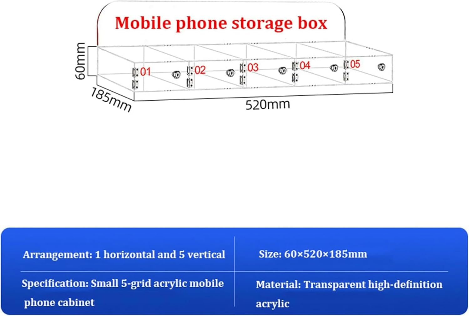 It is suitable for offices, conference rooms, cinemas, training rooms, factories, restaurants, businesses, confidential units, institutions, gyms, hospitals, waiting rooms, schools, and training institutions. It is suitable for storing small items such as cell phones.Name:Acrylic Cell Phone Storage LockerColor: ClearMaterial: Acrylic+MetalStyle: ModernProcess: Chamfering ProcessInstallation Method: Screw-InMounting Type: Wall Mount, FreestandingPackage Contents: 1xAcrylic Cell Phone Storage Locker1x Installation Accessories1x Key