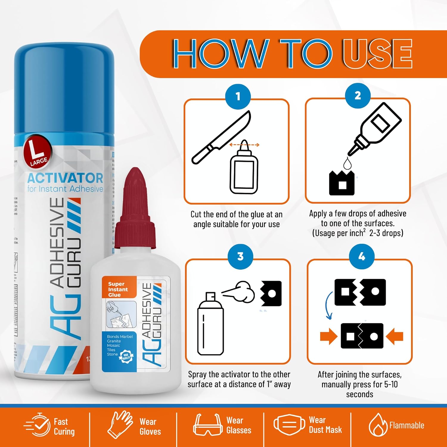 Adhesive Guru Stonebond Ca Glue with Activator has been specially formulated for use with products like ceramic, marble and granite. The two part superglue for stone will form a lasting bond and is a must have for anyone who needs to repair broken marble, ceramic, granite, glass, stone, brick, tile, or porcelain. Because this super glue is made for specialty stone applications, you can trust that the bond between surfaces will be long lasting. Perfect for most indoor applications, this instabond adhesive can be used in vertical surfaces with its special viscosity. It is water resistant but not recommended for continuous contact with water.