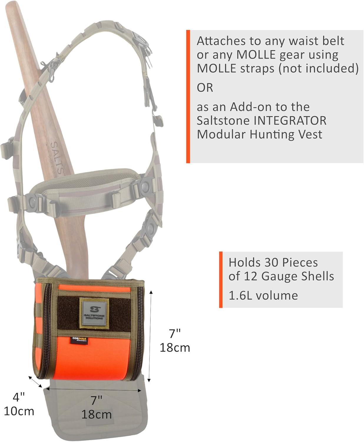 "The SALTSTONE Ammo Pouch is a compact, field-ready ammunition carrier designed to integrate perfectly with your SALTSTONE Integrator. Despite its lightweight profile, it offers 1.6 liters of secure storage — enough to carry 30 pieces of 12 gauge shells. What sets it apart is the innovative double rubber band entry system. Instead of relying on zippers or flaps, this smart design keeps your ammo accessible when needed — but automatically seals shut when the pouch is flipped or jostled. The weight of the ammo presses the opening closed, preventing accidental spills even during fast movements or when crawling through terrain. Built from rugged Cordura material, the pouch resists water, dirt, and wear. It attaches easily to either side of the Integrator vest and is available in Orange, Coyote, Green, and Brown."