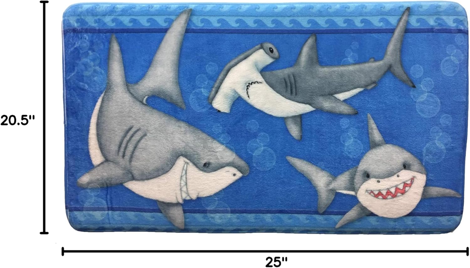 Complete your little pup's underwater adventure themed bathroom with our Fish 'N Sharks Bathroom Mat. Rug is skid resistant, machine washable, and made with memory foam. Fill is 100% polyurethane and shell is 100% polyester. Rug is 34. 25" wide x 20. 5" tall and weighs 13 oz.