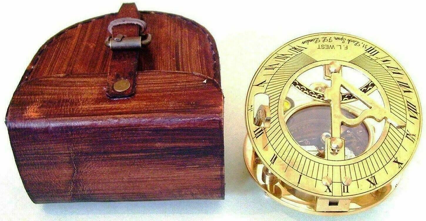 Step into a world of timeless elegance and nautical charm with our Brass Antique Vintage Handmade Nautical Sundial Compass. This meticulously crafted piece is more than just a navigational instrument; it is a blend of artistry, functionality, and historical significance. Perfectly sized and beautifully designed, it serves as an exquisite decorative item for both home and office environments.Key Features:Handmade Brass Construction: Each compass is expertly crafted from high-quality brass, showcasing the beauty and durability of vintage metalwork. The brass is polished to a rich, antique finish, highlighting the intricate detailing and craftsmanship that goes into each piece. This attention to detail ensures that each compass is unique, with its own distinct character and charm.Antique Nautical Design: The compass features a classic nautical design that echoes the style of historical maritime instruments. The antique finish and finely detailed engravings offer a glimpse into the past, making this compass a captivating piece for those who appreciate historical artifacts and maritime heritage.Integrated Sundial Functionality: In addition to its primary function as a compass, this piece includes a built-in sundial. The sundial feature adds an extra layer of historical intrigue and practical utility, allowing users to measure time as well as navigate. This dual functionality makes it a fascinating conversation piece and a functional tool for enthusiasts of historical navigation methods.Compact and Portable: With a diameter of 2.5 inches, the compass is compact and easy to carry. Its size makes it an ideal accessory for both personal use and display. The compact nature of the compass ensures that it fits comfortably in the hand or pocket, making it a convenient tool for those on the go.Elegant Leather Case: The compass comes with a finely crafted leather case that adds a touch of sophistication and ensures the protection of the compass. The leather case is designed with a vintage aesthetic, featuring a soft, supple texture and a secure closure. This protective case not only safeguards the compass but also enhances its presentation, making it a refined gift option.Perfect for Gifting: This brass compass is an exceptional gift choice for various occasions. Whether celebrating a milestone, marking a special event, or simply looking for a thoughtful present, this compass is sure to impress. Its combination of historical charm and practical functionality makes it a memorable gift for birthdays, anniversaries, retirements, or any special occasion.Decorative Appeal: The compass makes a stunning addition to any home or office decor. Its antique design and brass finish add a touch of elegance and sophistication to any setting. Whether displayed on a desk, bookshelf, or mantel, this compass serves as a beautiful and functional decorative piece.