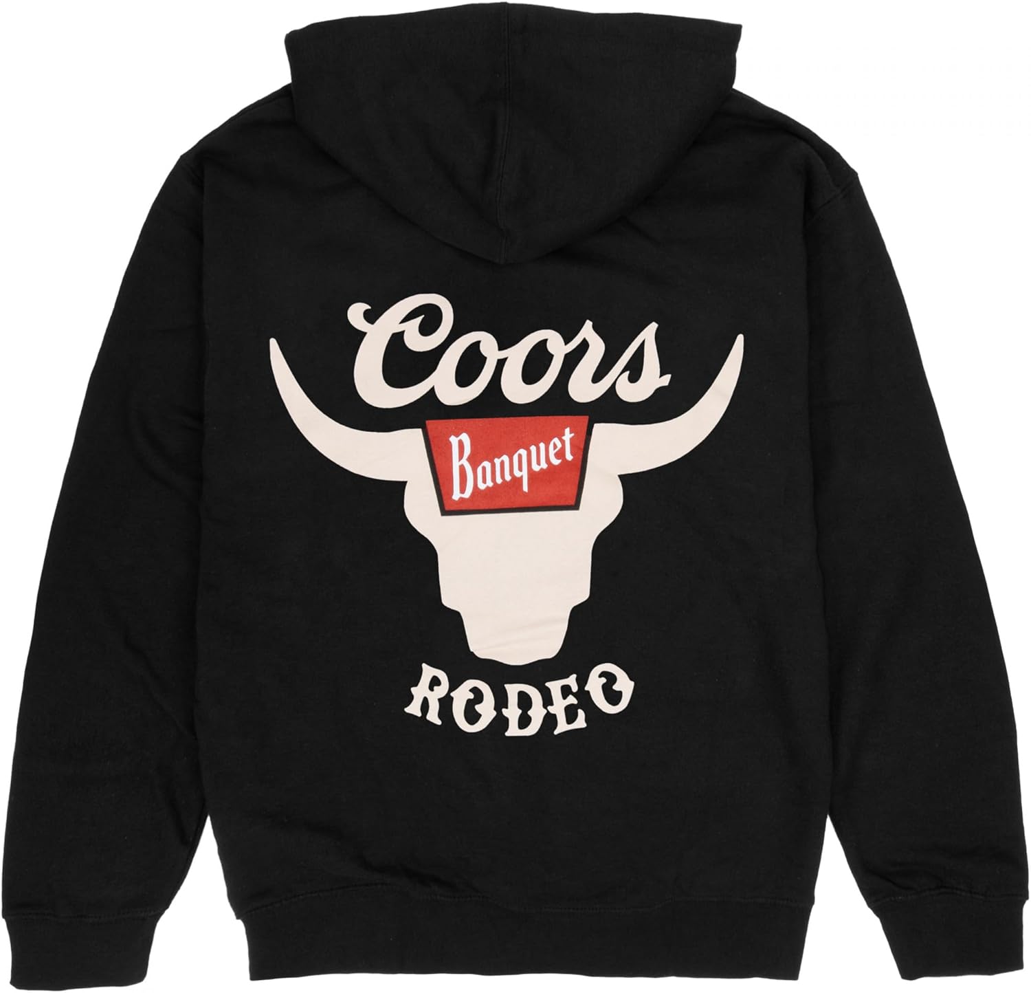Officially licensed Coors Banquet Rodeo Horns Logo Front and Back Print Hoodie. This black "Coors Banquet" hoodie is made from cotton and features the "Coors Banquet Rodeo Horns" logo design printed on the front and back.