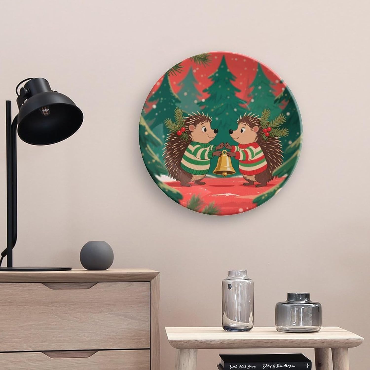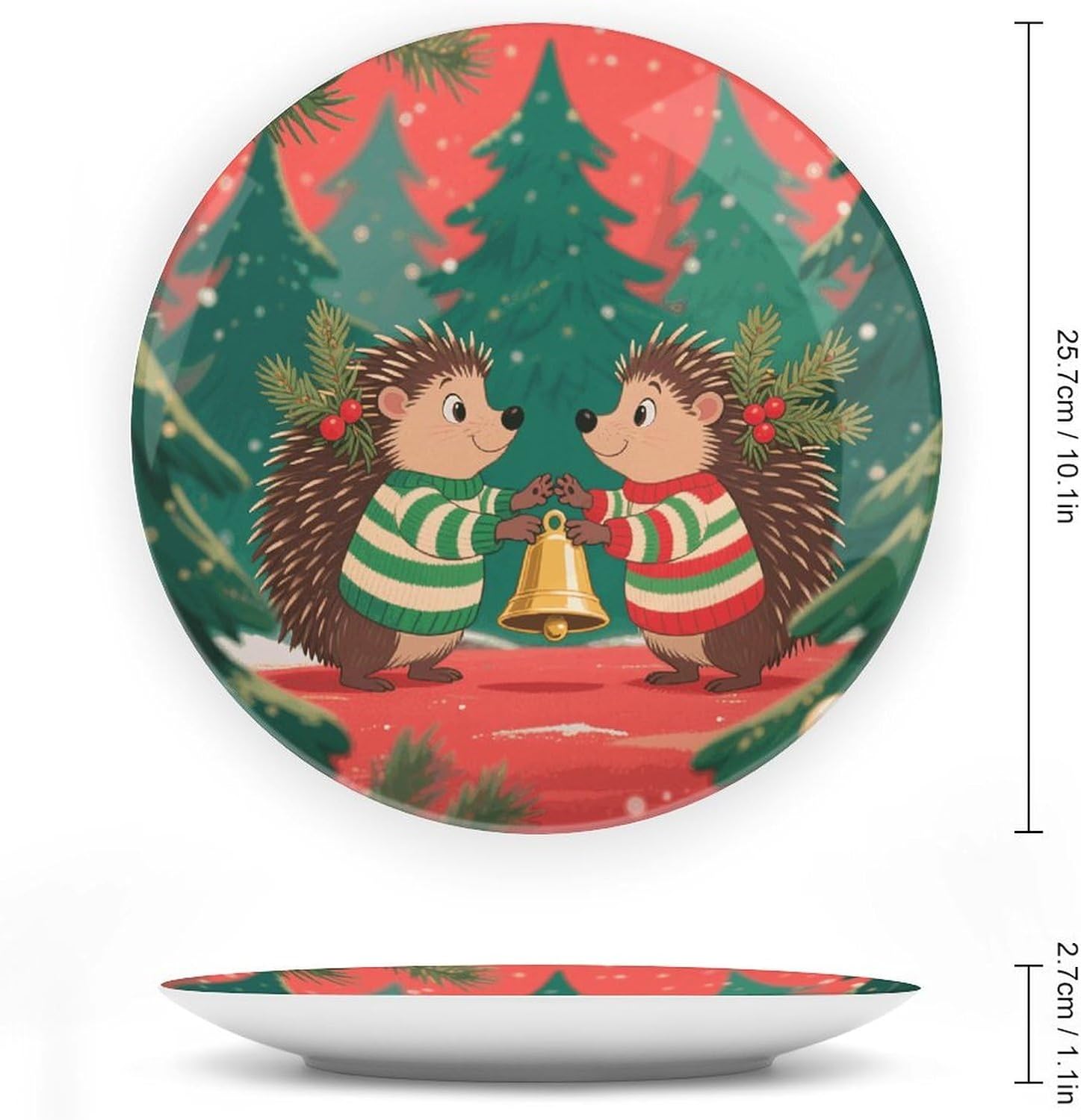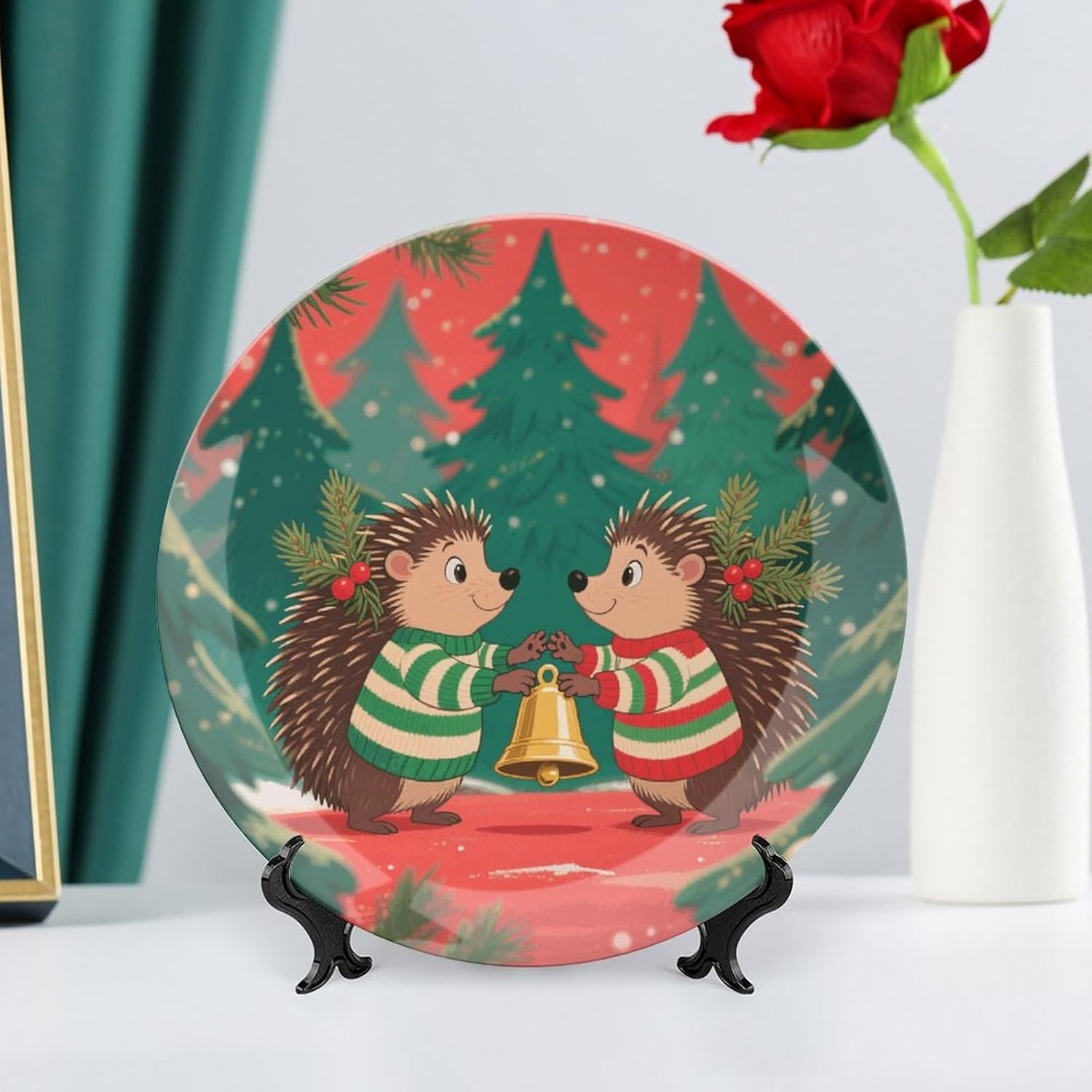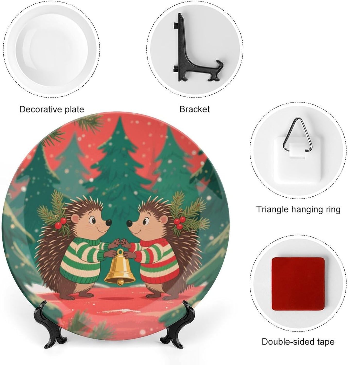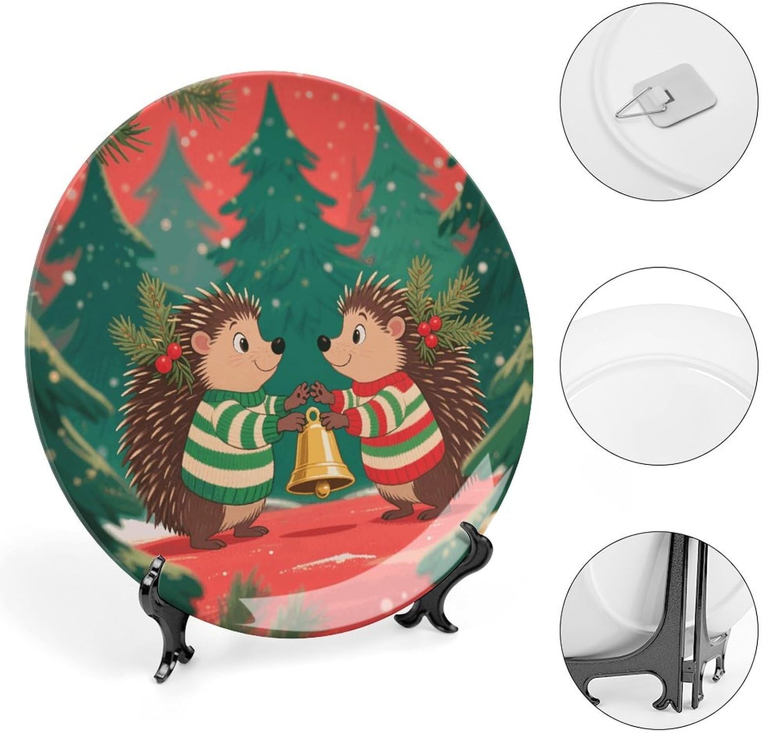 Christmas Hedgehogs Decorative Plate for Display, Christmas Hedgehogs Bone China Decorative Plate, Christmas Hedgehogs Ceramic Dinner Plate with Stand, Christmas Hedgehogs Vertical Ceramic Plate for Home Office Kitchen Table/Wall Hanging Decor