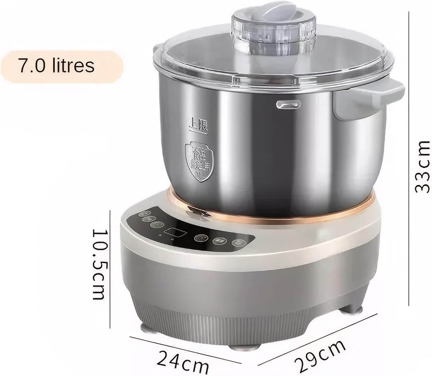 Functions: 1) Automatic dough kneading and dough proofing, easy and good taste 2) Top-mounted touch panel: easy operation without bending over 3) Microcomputer timing: set intelligent dough kneading + constant temperature dough proofing at the same time 4) Intelligent constant temperature: constant temperature fermentation makes the dough grow quickly, constant temperature: 25-38° 5) Dough proofing is strong: absorbs water to expand, and the dough is elastic 6) Fast dough proofing: shortens the fermentation time and makes the dough soft 7) Multi-sided heat dissipation holes: quickly dissipate heat to protect the dough mixer from continuing to work Specifications Product name: Flour mixing and kneading machine Pot size: 29*24cm Entire product size: 33*29*24cm Material: stainless steel + PP + PE Color: gray Capacity: 5L/7L Rated voltage: 110V Motor speed: below 10,000 rpm Applicable number of people: 6 people and above Mixing blades: multiple mixing blades Application: kitchen baking, pasta Scale mark: inner wall mark Purpose: semi-automatic Whether plugged in: yes Control mode: microcomputer type Perfect For: Home cooks, baking hobbyists, small bakeries, holiday baking (mooncakes, pie crusts), or baby food prep – say goodbye to hand fatigue and hello to professional-grade dough! Package includes: 1*Electric large-capacity kneading machine 1*Plastic measuring cup 1*Plastic spoon 1*Instruction manual How to use: - Knead dough separately: 1. Press knead dough 2. Select time - Mix dough + wake up dough: 1. Press knead dough 2. Select time 3. Press wake up 4. Select time Warm reminder: Different ratios of dough and water will affect the viscosity of the dough, please refer to the manual for operation.