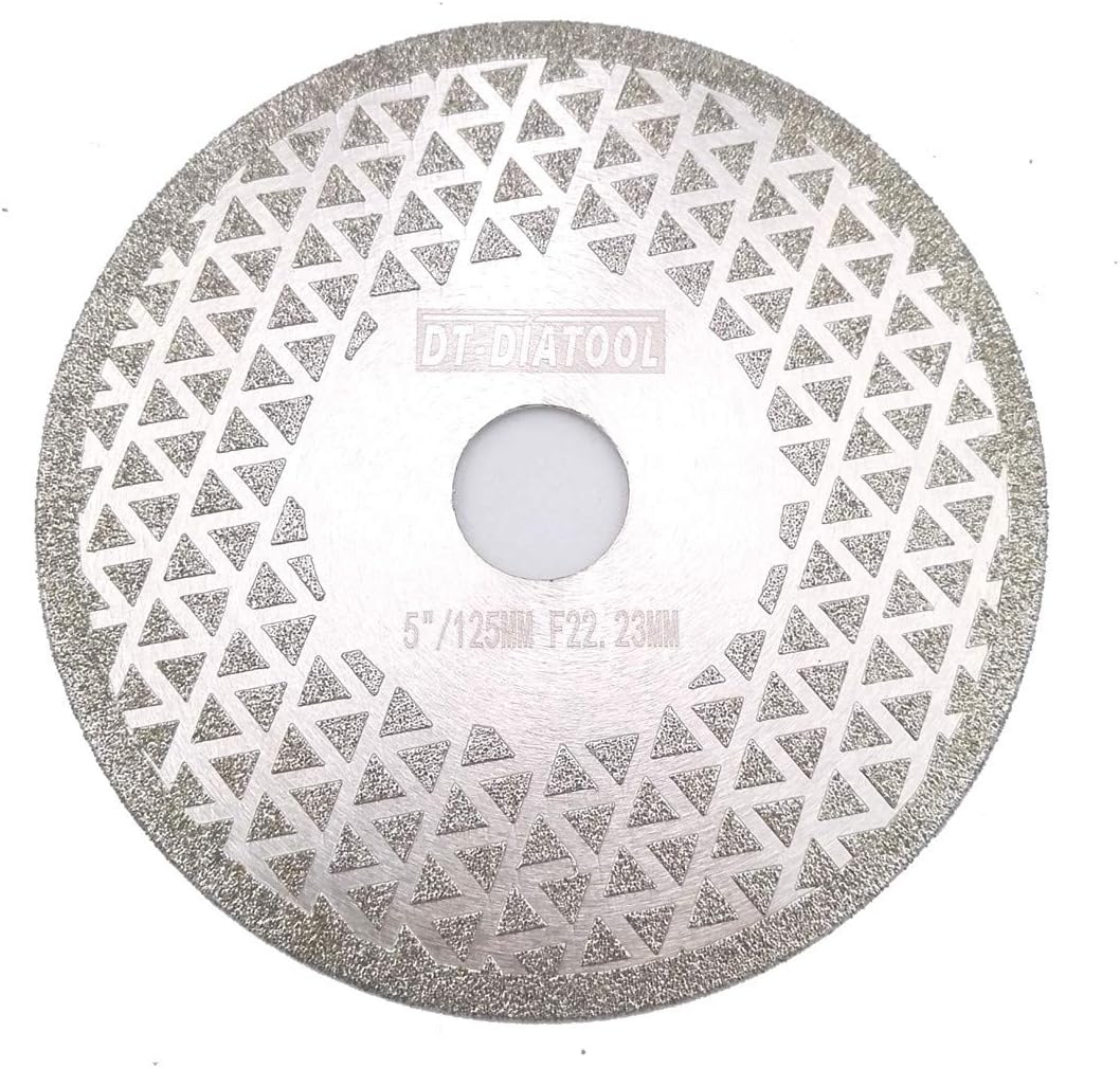 ---------------------Description------------------------------- Product Name:DT-DIATOOL 2pcs 5 inch Electroplated diamond cutting and grinding discs Saw Blade, double side coated Specification:Diameter 5 inch/125MM,Bore 22,23mm; Quantity: 2pc 5 inch Feature: Multi puprose, Cutting and grinding granite marble natural stone tile Professional industrial Diamond electroplated on the steel core, 100% diamond exposed, high efficient Triangle Spots coated on one side for Grinding purpose, lower cost Dry or Wet, wet working will prolong the working life =======The End======= Other availabe size: 5"/125MM,7"/180MM,9"/230MM