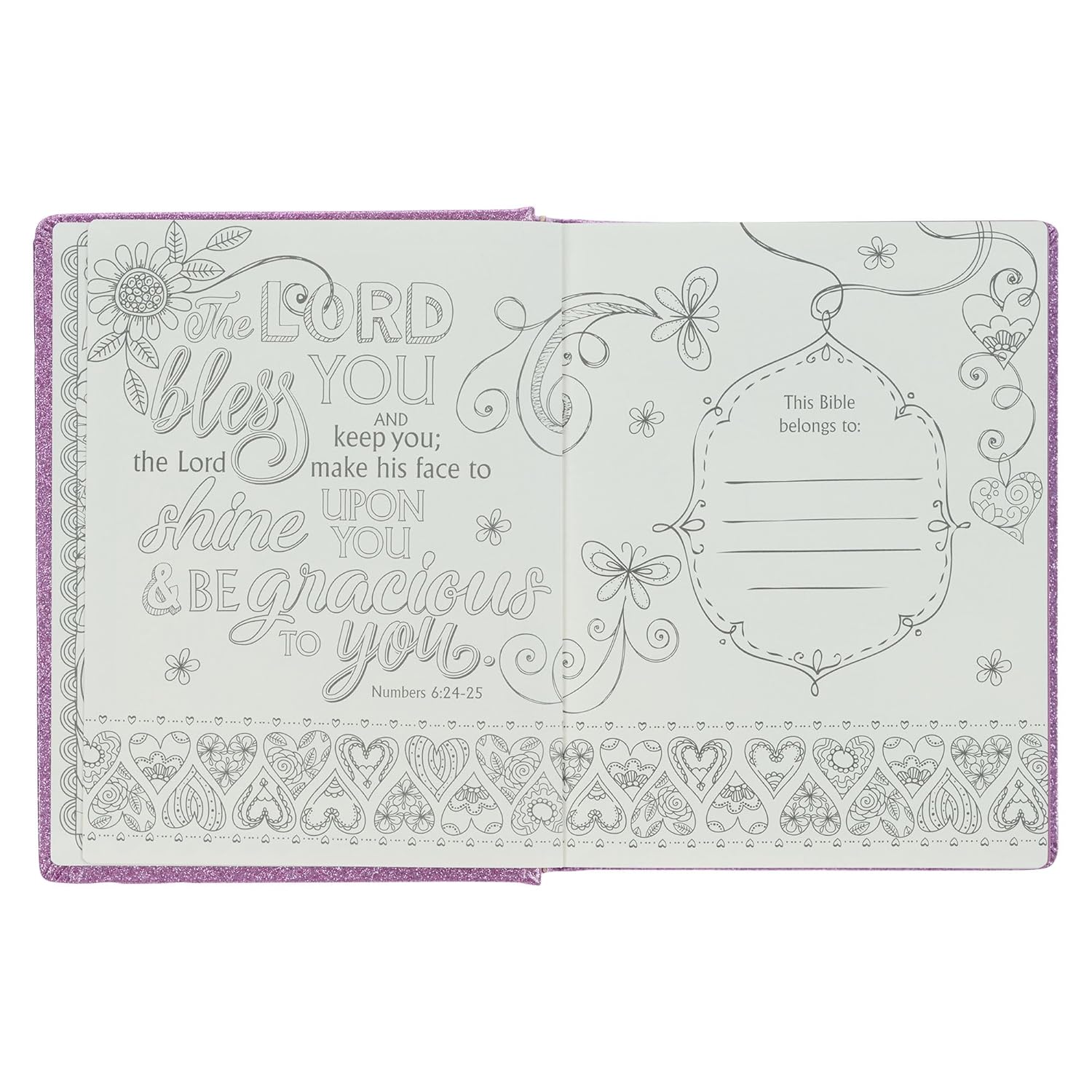 Let young girls immerse themselves in Scripture while living out their natural creativity when they work through the Purple Glitter Hardcover My Creative Bible for Girls. This Bible is an illustrated journaling Bible designed to spark creativity in young girls. An eye-catching glittered purple faux leather cover is heat-debossed with hearts that are foiled in silver. The title is heat-debossed and silver-foiled on the hardcover and sandwiched between a large silver-foiled crown at the top and a heart motif at the bottom. My Creative Bible Silver-foiled butterflies flutter across the front and back covers and settle on the spine, where you will also find a repeat of the silver-foiled title. Holographic gilt-edged pages and a bright satin ribbon marker add a little extra dazzle to an already sparkly design. The full ESV text is included in the Purple Glitter Hardcover My Creative Bible for Girls and is formatted in a single column. Fun, inspiring line-art illustrations throughout the Bible pages will draw your daughter in and etch Scripture on her mind. The fun starts right away with illustrated end pages just waiting to be colored. The presentation page allows you to add color and a name or message when it is given as a gift. The text is organized in a single-column format and flanked by two-inch-wide margins filled with fun and inspiring line drawings, lined space to record notes, and illustrated devotional panels. You can even use these margins to create your own doodles. The Bile features two content lists: one lists the books of the Bible in chronological order, and the second lists the books alphabetically. A Bible Memory section includes 66 well-loved Bible verses that every Believer should know and 12 line drawing prayers that will help young girls learn to pray about everything, are ready to be colored and memorized. A line drawing illustration introduces each book of the Bible, and the content that follows is accented with pink banners and highlighted text. 366 devotions set in the margins offer inspiring messages to help girls apply biblical truth to their lives. Inspirational stories of 50 memorable women characters in the Bible will motivate girls to pursue a life of faithfully following God. The Purple Glitter Hardcover My Creative Bible for Girls will inspire young ladies to delve deeper into the Word of God through devotions and Scripture. Help your daughter, granddaughter, niece, or princess find her worth in the Word of God. Complete ESV textHardcoverPurple glitter faux leatherSilver-foiled accents on coverHolographic-edged pagesPurple satin ribbon markers2-inch margins1548 pages66 memory verses366 devotions50 women of the Bible profiles300 lined illustrations12 full-page Scripture prayers20 full-page Scripture versesIllustrated presentation page for gift-givingPackaged in full-color printed gift boxSize: 8.2" x 6.5" x 1.9" (208 x 165 x 48mm) Read more