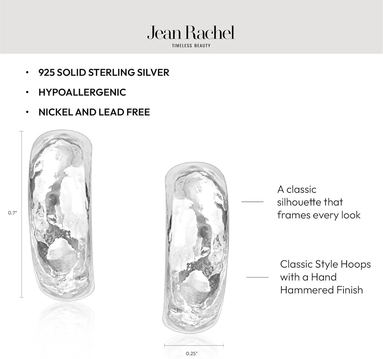 Discover the elegance of Jean Rachel Jewelry’s Hammered Hoop Earrings, a modern twist on the classic hoop. Handcrafted from solid 925 Sterling Silver, these chunky hoops measure 0.7" in length, 0.25" in width, and 0.1" in thickness, making them the perfect size for subtle yet striking style. Designed for sensitive ears, these hypoallergenic hoops earrings for women are free from lead and nickel, ensuring all-day comfort. The secure post closure offers a reliable fit, while the polished silver surface reflects light beautifully, adding instant refinement to any look. Whether paired with jeans and a tee or a sophisticated evening ensemble, these bold hammered hoops transition seamlessly from day to night. Their non-tarnish finish ensures they remain a staple in your jewelry box for years to come. Part of the Jean Rachel Jewelry collection, these hoops reflect our dedication to crafting heirloom-quality sterling silver earrings for women that merge timeless elegance with modern design. Perfect as a thoughtful gift or a personal treat, the Hammered Hoops are proof that everyday jewelry can be both comfortable and unforgettable.