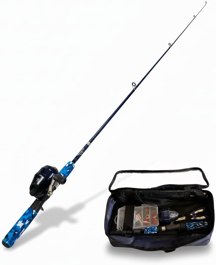 Get your angler started right with this complete hands free (no touch) fishing kit! This comprehensive starter set includes everything needed for a successful day on the water: a perfectly sized rod and reel combo featuring an easy-to-use reel, a practical tackle box stocked with essential fishing accessories, a sturdy landing net for securing catches, and reliable fishing pliers for handling hooks safely. The rod sports an attractive blue camo pattern that kids and adults will love, while the durable construction stands up to learning experiences. The included carrying case keeps everything organized and makes transportation a breeze. The rod's comfortable grip and balanced design help build confidence as new fishers develop their casting and reeling skills. Perfect for fishing from docks, shores, or boats, this all-in-one kit provides everything necessary to create lasting fishing memories and teach fundamental angling techniques. An ideal gift for introducing children to the rewarding hobby of fishing.