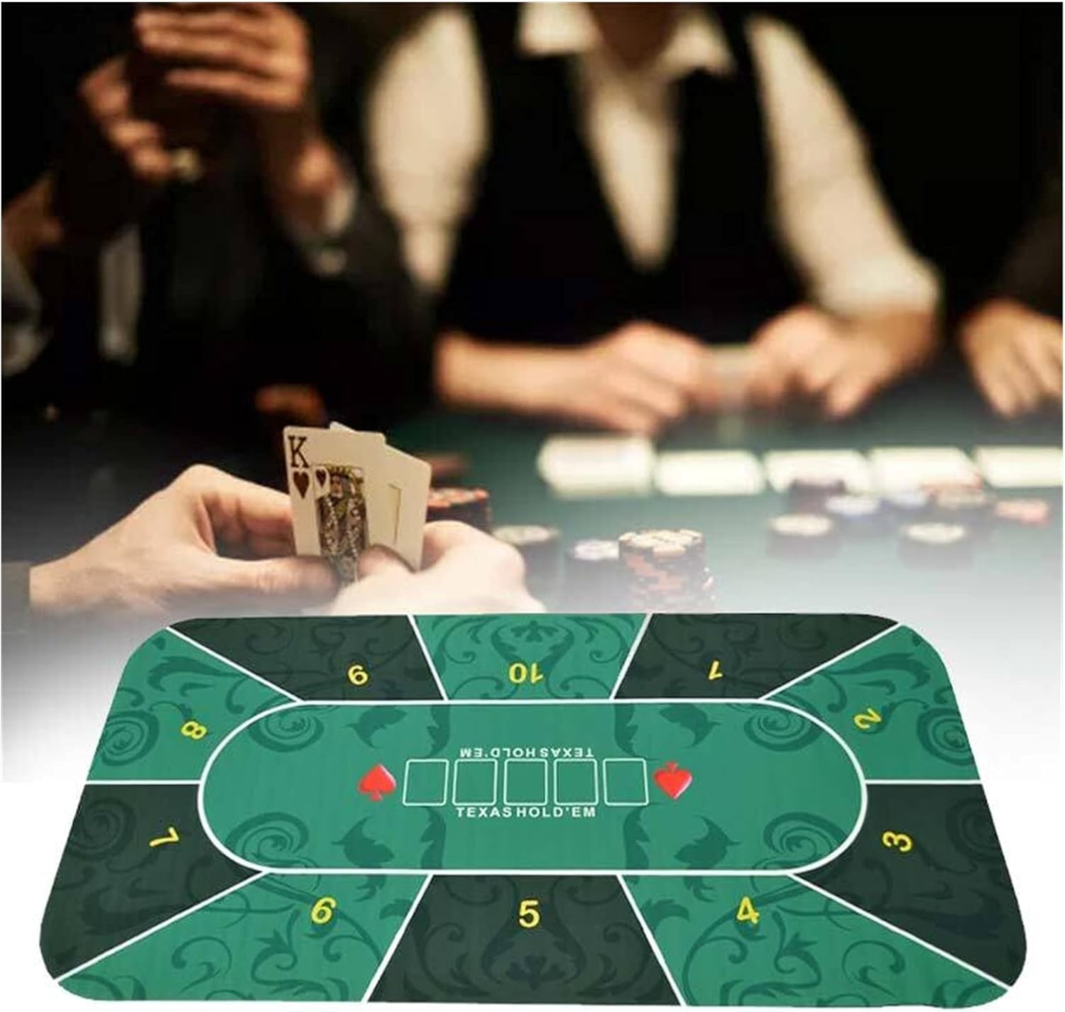 Thanks to the smooth fabric surface,no lint like a felt mat and no scratching like a table top.The carefully crafted edge seam guarantees long-lasting fun Professional quality felt that you can enjoy in the comfort of your own home or use for a casino theme party.It will feel like a real casino no matter where you host your card gaming nights. Specifications: Name:Texas Tabletop Mat Material:rubber bottom,flannel surface Size:about 1.2x0.6m/47.24x23.62in Thickness:about 2mm/0.08in