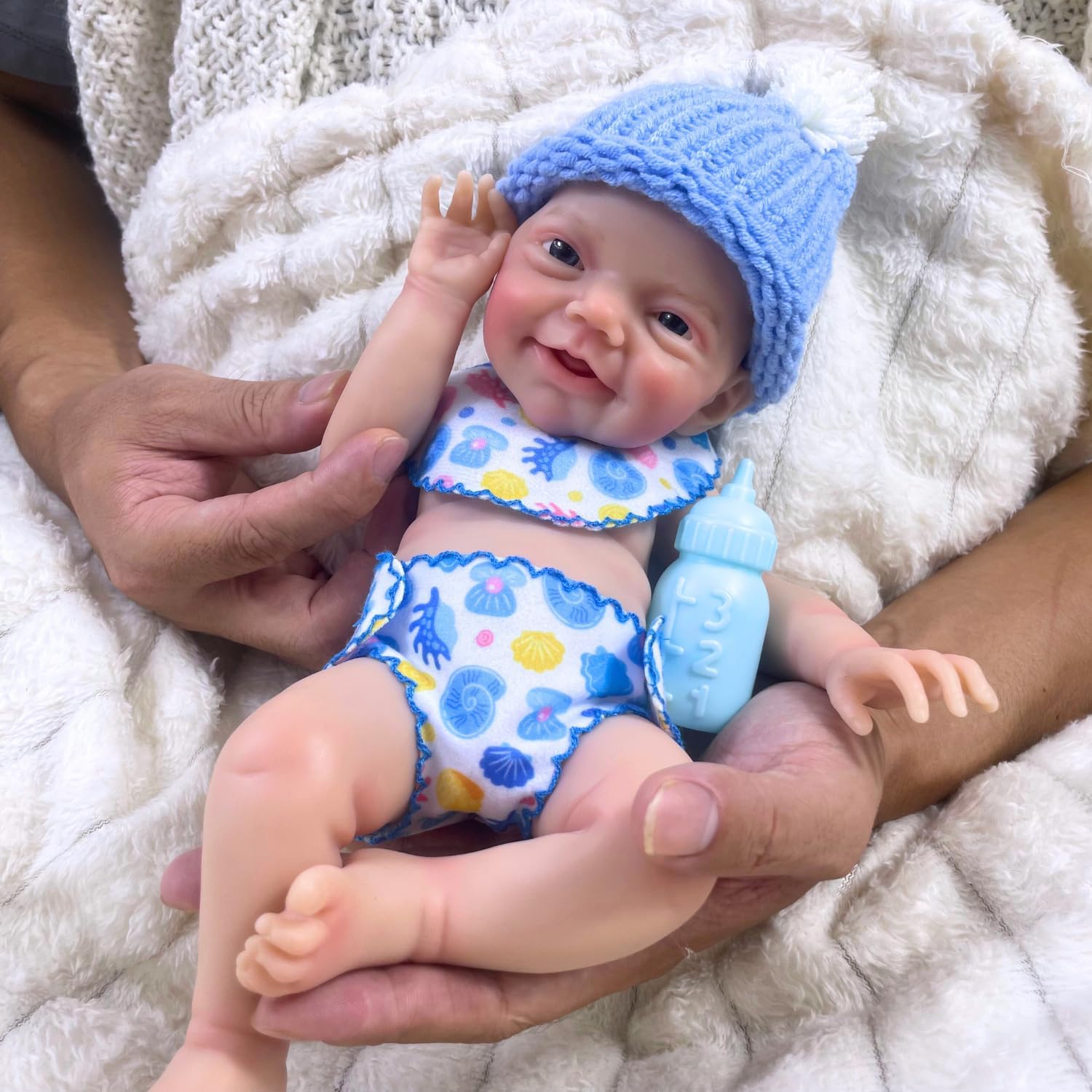 NOTE:This doll is made of silicone and is softer than traditional vinyl dolls. You need to take more care of silicone dolls. ** When making a doll, the silicone injection hole will be left on the head, and there are some mold lines on the body, but this is not a quality problem. BABY DOLLS FEATURES SIZE: Finished doll head-to-toe about Mini 12-13 inches(about 30-33 cm) Material: Silicone Gender: Boy/ Girl Hair: Bald, no hair Eyes: Open, blue eyes Mouth: Open Weight: Doll Net weight is around 1kg ——Dolls produced in different batches may have slight differences, which will not affect normal use