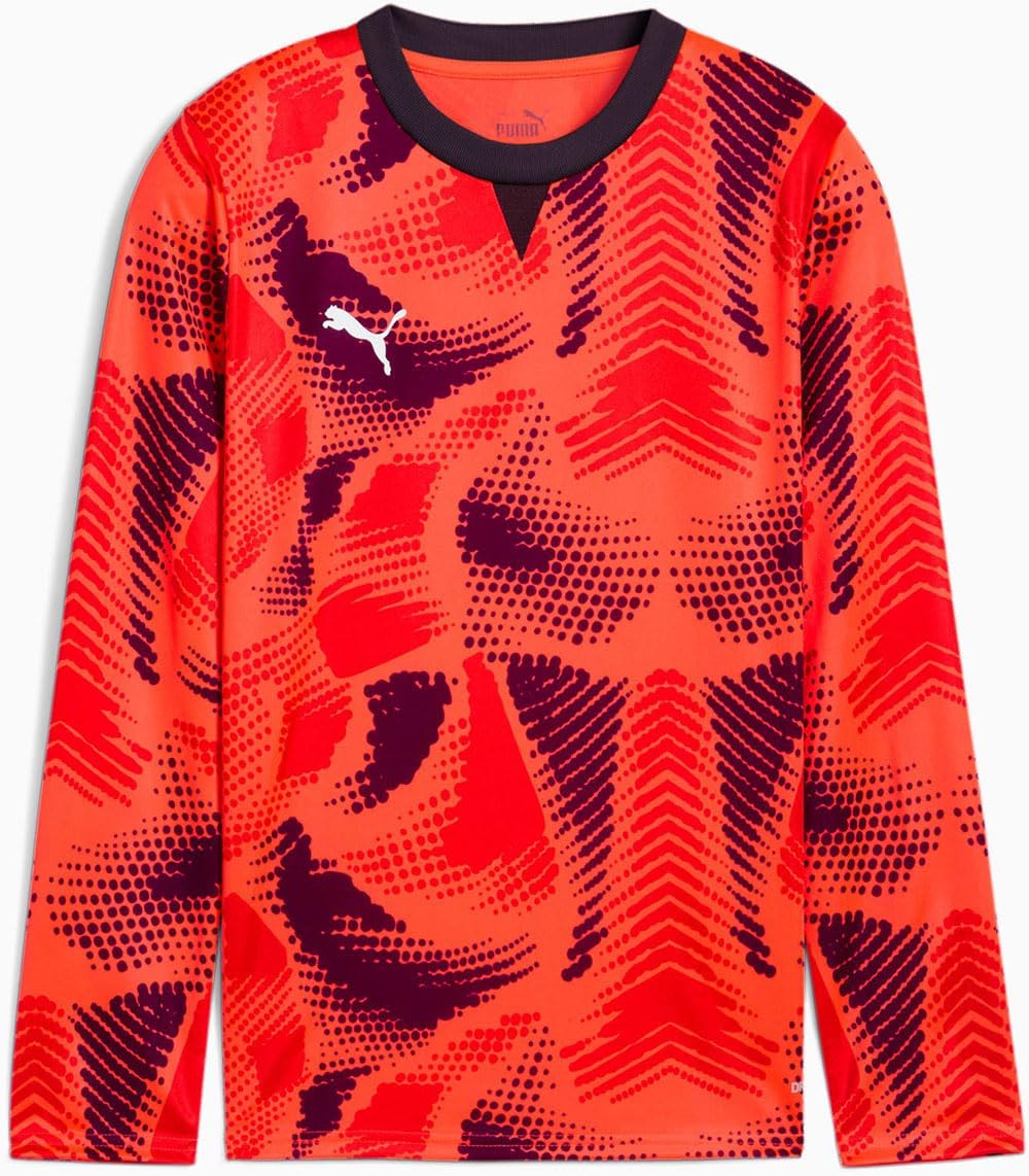 Guard the net in style with this PUMA goalkeeper jersey. A disruptive two colored graphic wraps the front, back, and sleeves to keep strikers guessing, while mesh side panels dial up airflow when the match heats up. The long sleeve, crew neckline design sits in a regular, easy-to-move fit that layers comfortably over base gear. Finished with a right-chest PUMA Cat logo, this jersey is made for goalkeepers who command their box and play Forever Faster.