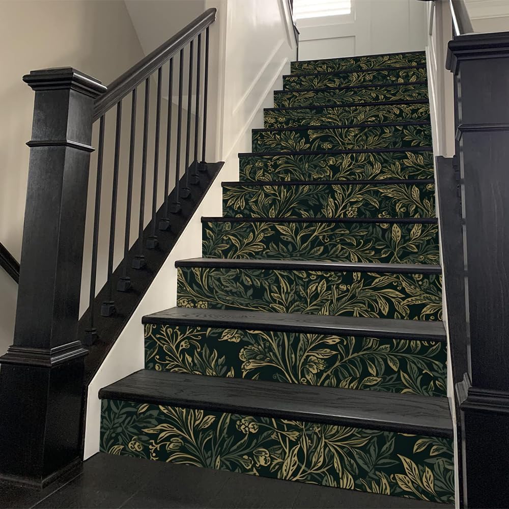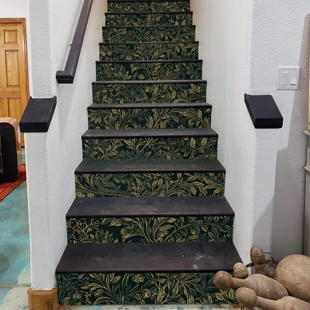 Transform your staircase with our REDAMANCY Vintage Dark Black Green Vine Leaf Plants Peel and Stick Vinyl Stair Riser Decals. These 14 reusable, rectangular stickers feature intricate custom artwork of raised panel vine leaves, adding a touch of vintage floral charm to your indoor walls or stairs. Measuring approximately 11.8 x 7.9 inches each, they're perfect for wood, marble, or tile surfaces. Easy to apply and remove, they're water-resistant and come with a glossy finish for a polished look.