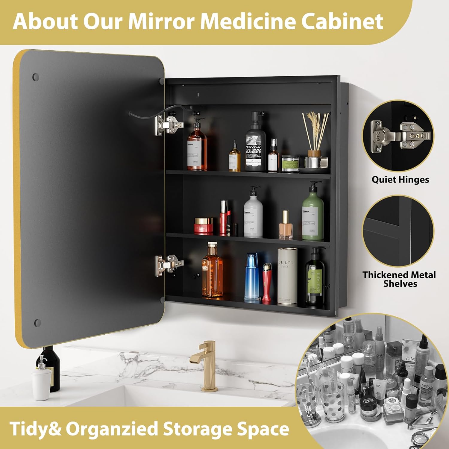 | Additional Features | IP44 waterproof; LED Light;Metal Frame, Rust-Proof, Moisture-Proof, Shatter-Proof; Silent hinge; 3-tier shelf; Tempered Glass |