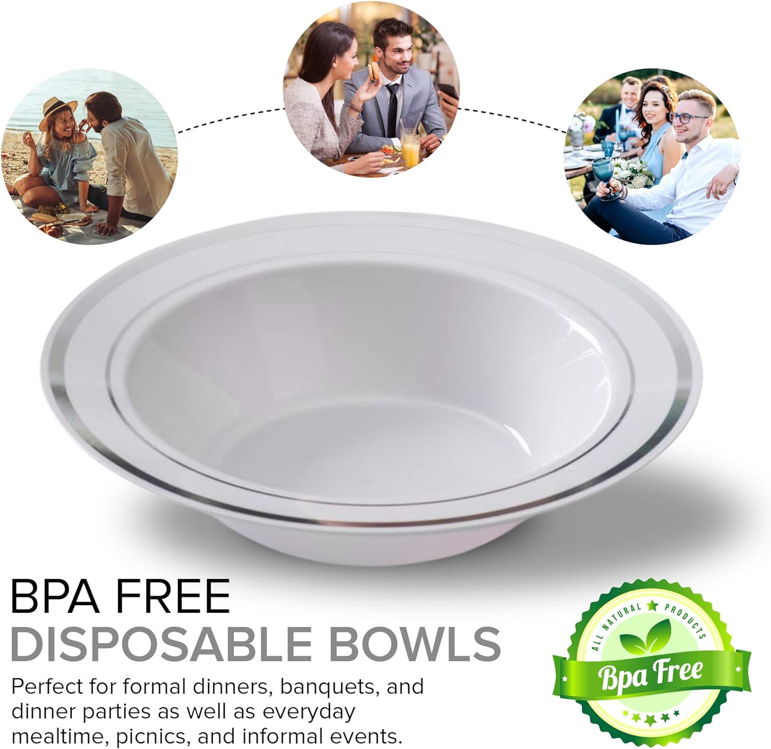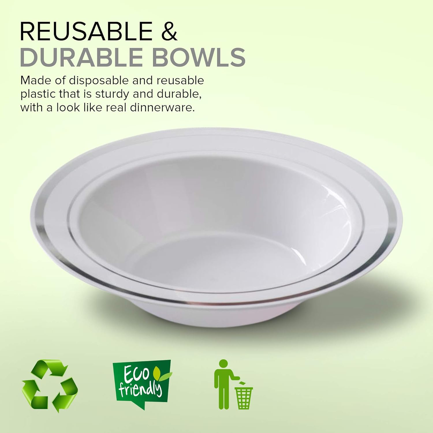 Stock Your Home Elegant 300 Piece Plastic Bowls Set has a classic, refined look and design that makes it even more appealing than real dinnerware. This service for 50 dinnerware set can replace conventional plates for big family meals or special events and banquets. These heavyweight plastic bowls are designed to withstand even the most temperature intensive foods while maintaining their form and shape. They will last through the entire meal till they are thrown out, or washed and reused for the next meal. Save clean-up time by throwing them out after use, while still enjoying the decorative and elegant accent they add to your event.