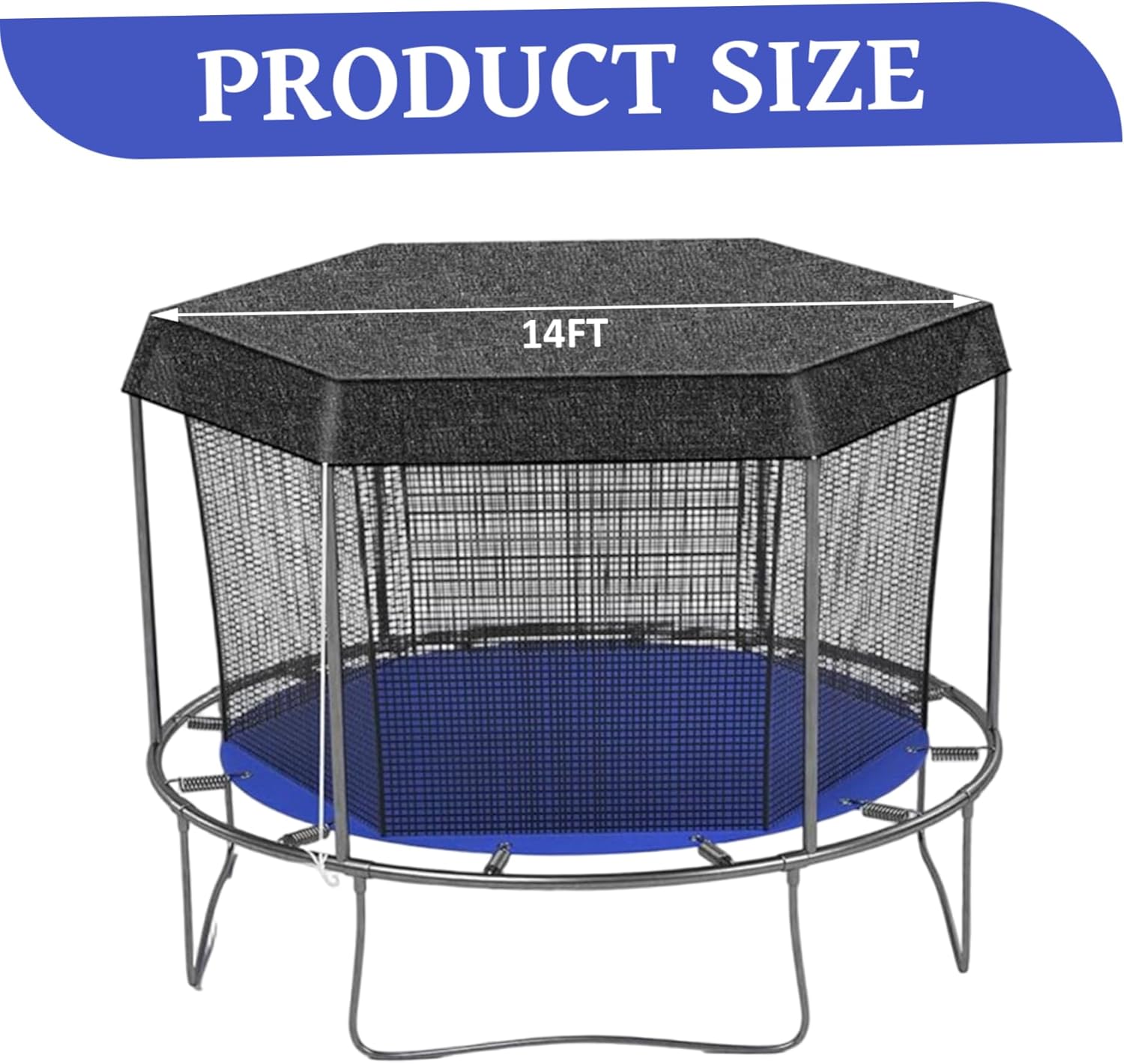 Description: Protect your trampoline and your fun rain or shine! This Trampoline Shade Cover is designed to shield your trampoline from harsh weather while keeping jumpers cool and safe during play. Whether it's for the backyard, playground, or outdoor space, this wear-resistant cover provides dependable sun protection and long-lasting durability. Crafted from TPE materials, the cover is resistant to UV rays, water, and tearing. It comes equipped with a secure connecting rope that makes installation quick and easy no tools needed. Its universals design fits most standard trampolines, providing full coverage over the jumping area without interfering with bounce or safety net features. Features:. -Color: Black. -Material: TPE. -Size: 14 ft. Note: Manual measurement, please allow slight errors on size. The colors may exist slight difference due to different screens. Package Including 1 * Trampoline Cover
