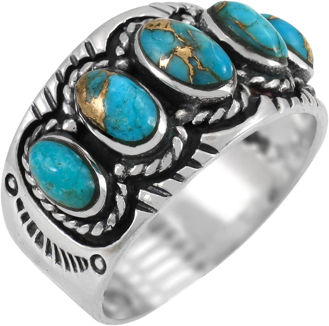 Contemporary ring for everyday wear or that super special occasion. Solid sterling silver and genuine gemstones (with natural turquoise that has been treated/color-enhanced). Fine craftsmanship. Trendy but with a touch of Southwest flair that is always exciting!Approx 1/2" wide (see ruler image).Gemstones Note: Due to the nature of these gemstones, variations in colors/shades/matrix and imperfections are normal. Our turquoise has been stabilized, treated, and color-enhanced for beauty and durability.Imported