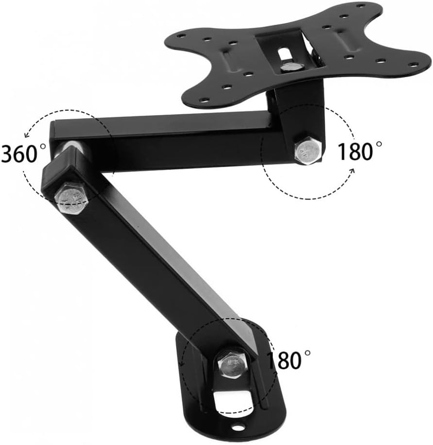 Type: AdjustableSize: as shownMaterial: cold knot boardColour: BlackFunction: Universal TV Wall Mount, TV Wall Mount Bracket, Monitor Stand, Arm TV, Adjustable Wall Mount TV Stand, Monitor Stand, TV Base, TV Mount Wall MotorRotation angle: 180 degrees (left and right), 30 degrees (up and down)Scope of application: Suitable for most high-definition flat-panel TVs, LCD TVs, LED TVs, and plasma TVs. Suitable for living room, KTV, bar, airport, railway station, bus station, shopping mall, shopping mall waiting hall, lounge, large conference room, classroom, lobby, restaurant and other family, entertainment, public and commercial places.notes:- When purchasing, please check whether the spacing between the holes of your TV is consistent with this product, and whether the weight is less than 10kg.-The number of product accessories is more or less, but it does not affect the installation and use.Package Included1 TV Wall BracketDue to different monitors and lighting effects, the actual color of the item may be slightly different from the color shown the picture. Thanks!Due to manual measurement, please allow 1-3mm measurement deviation.